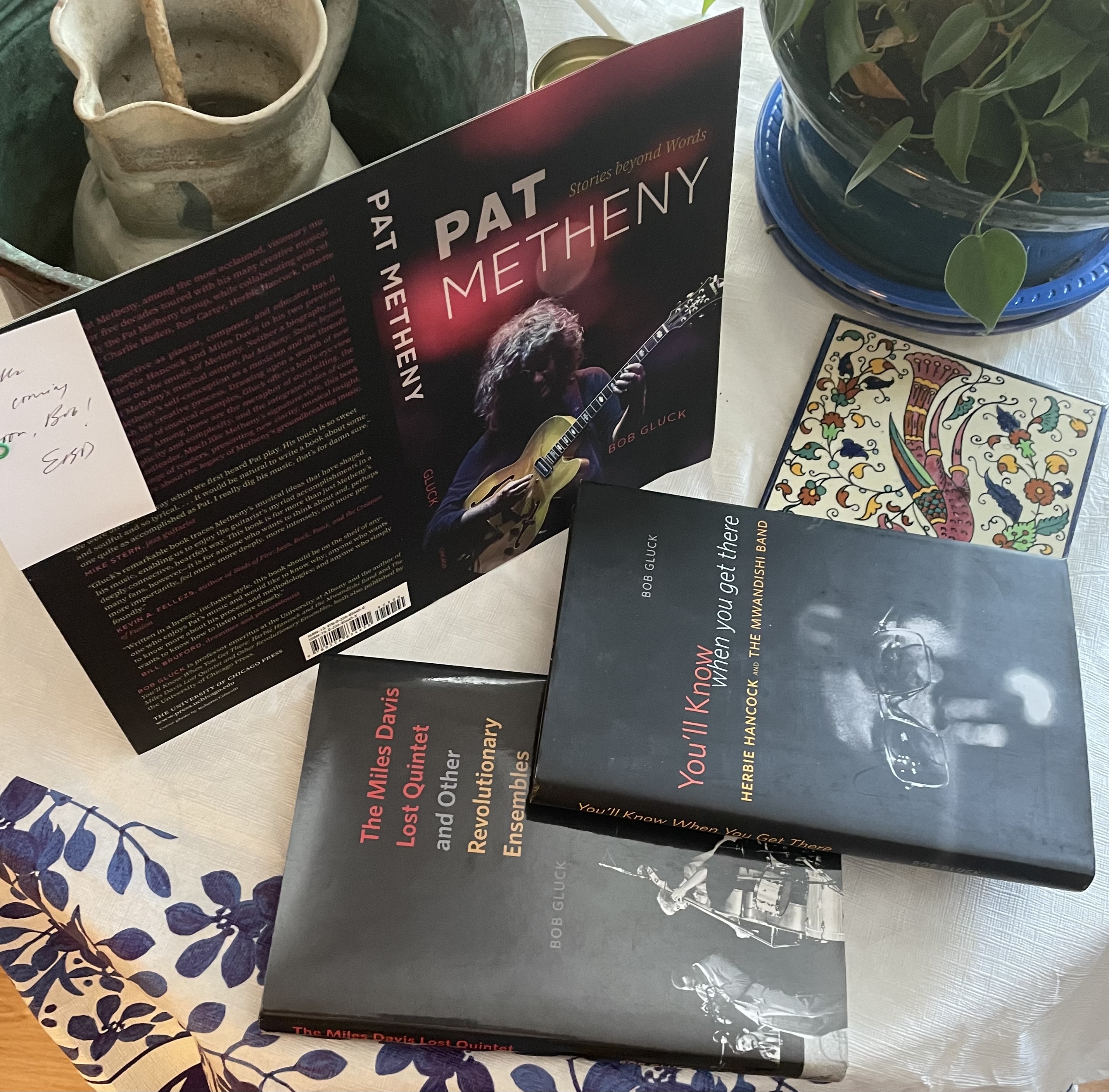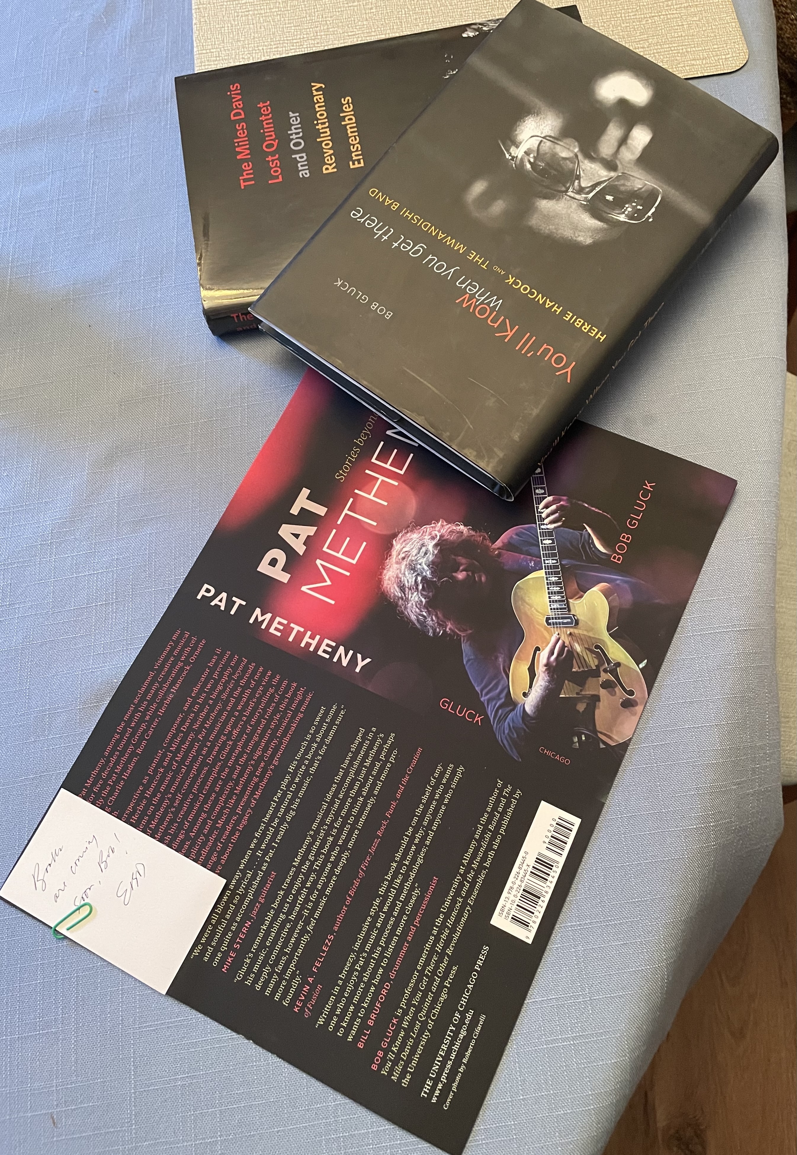 I kiddingly refer to these two pictures “the cousins” since both includes all three of my three University of Chicago Press books – “You’ll Known When You Get There: Herbie Hancock and the Mwandishi Band” (2012), “The Miles Davis Lost Quintet and Other Revolutionary Ensembles” (2016) and now, “Pat Metheny, Stories beyond Words” (coming August 5, 2024). Here they are! The cover photo on the new book is by Roberto Cifarelli.